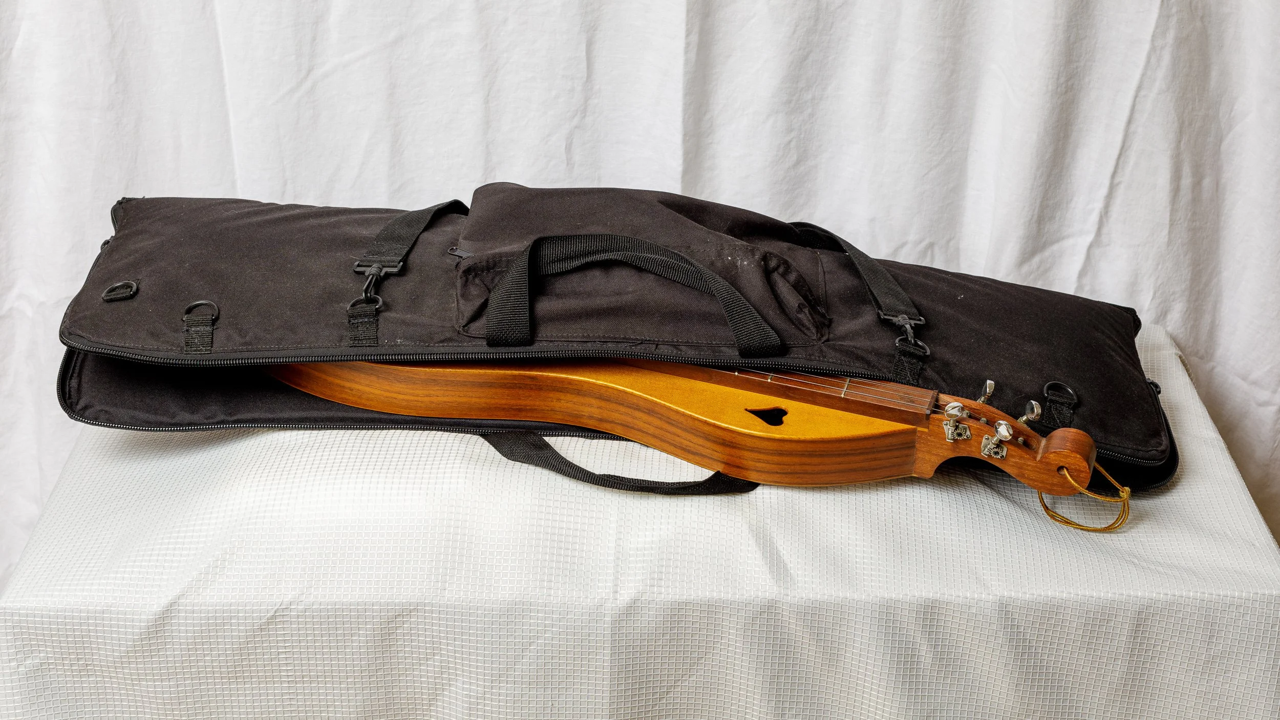 This wooden dulcimer is in excellent condition and comes with a carrying case.
