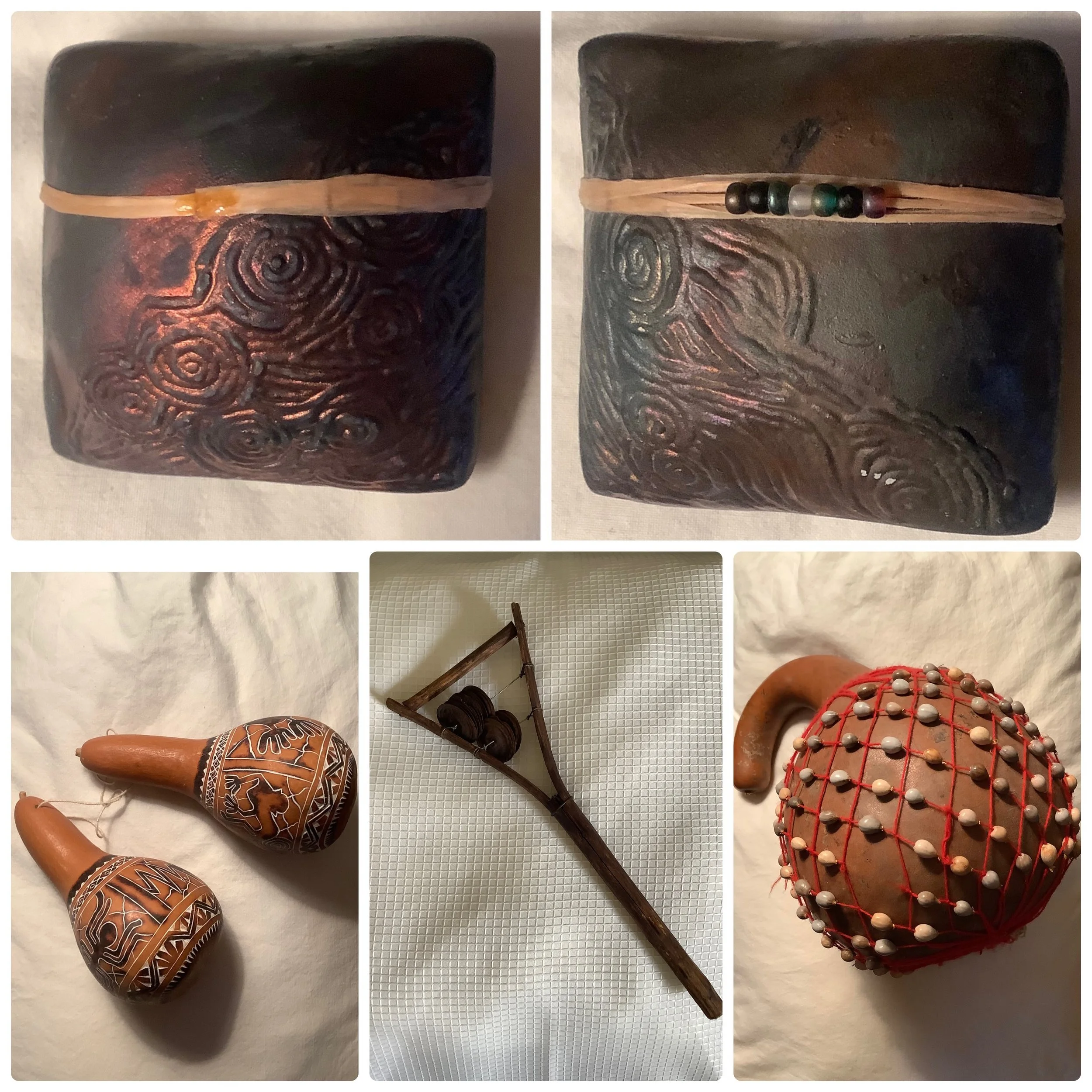 An assortment of interesting musical rattles and shakers from various parts of the world.
